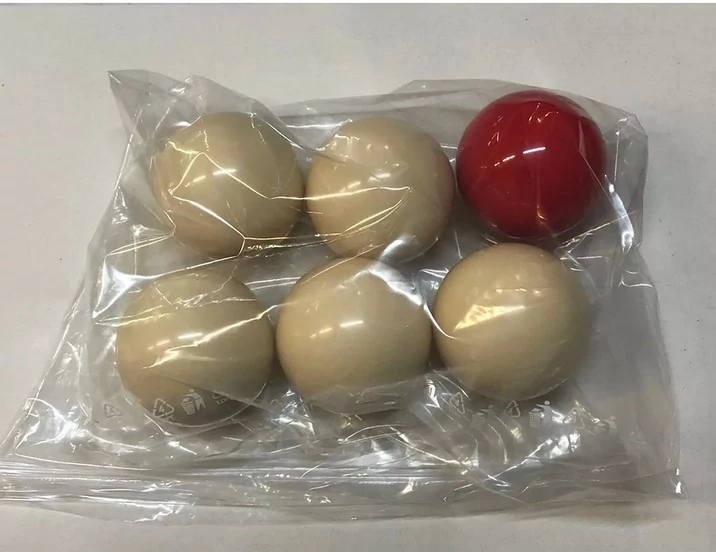 A golyók átmérője 47,6 mm,a készlet öt fehér + 1 piros golyót tartalmaz